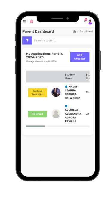 In the Enrollment Page click the button "Add Student" to add the student in your account that you are applying to the school.