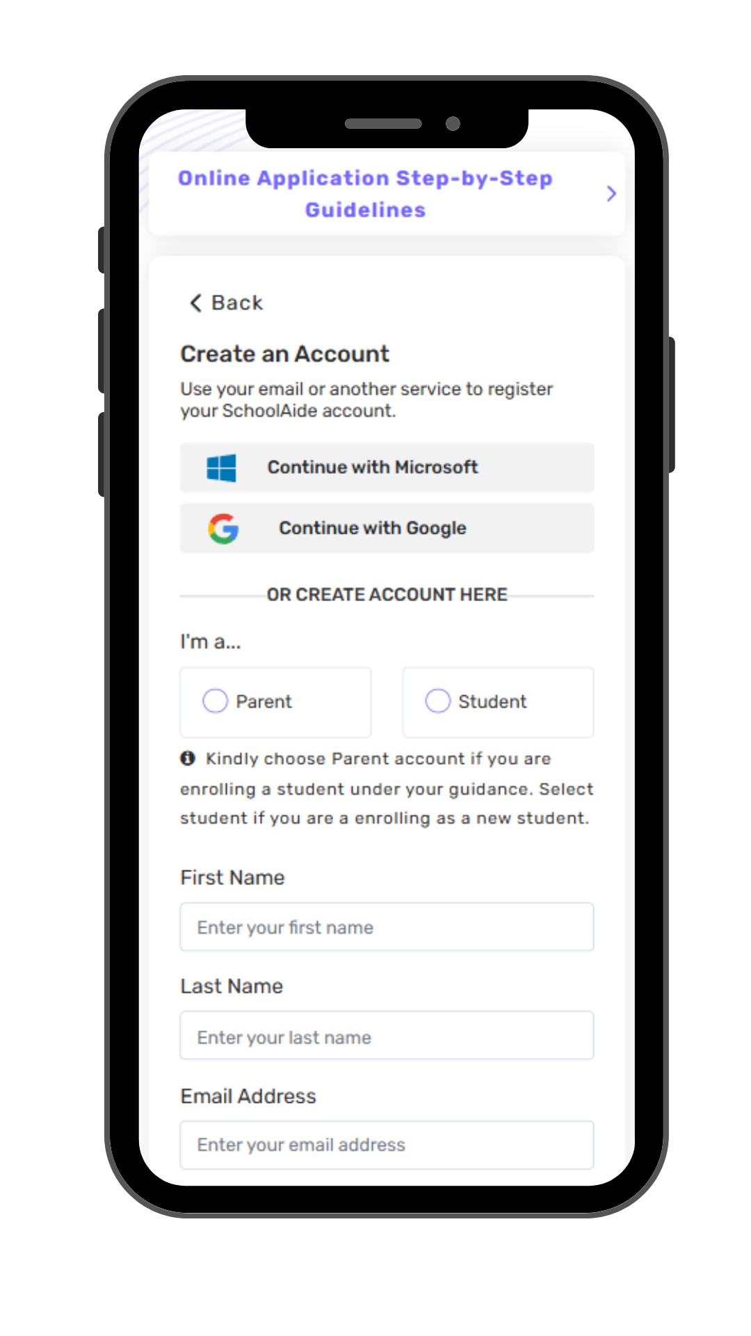 Fill the necessary information to create your SchoolAide account OR create your account with your existing email address using Microsoft or Google Account.